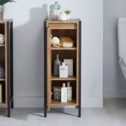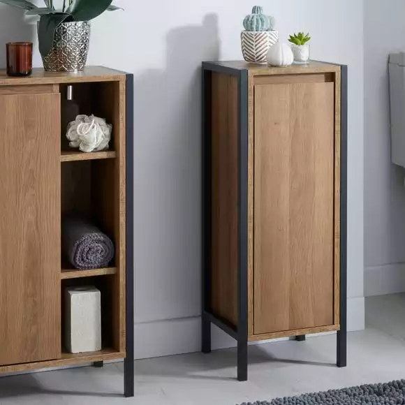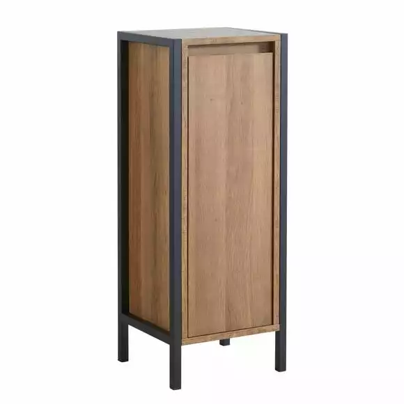Boasting an oak effect and black metal frame this cabinet gives your bathroom a ultra modern finish whilst also providing you with storage space. With 3 internal shelves this unit is ideal for organising and storing all your bathroom essentials neatly and discreetly. With a sleek handle-free design his unit is easy to clean and would look beautiful in any bathroom.