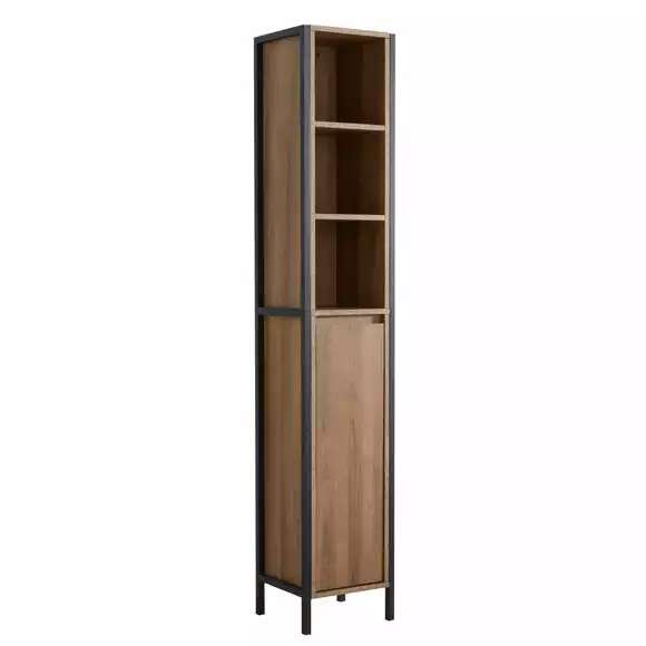 Boasting an oak effect and black metal frame this Tall Cabinet gives your bathroom an ultra-modern touch whilst also proving you with ample storage space. With three display shelves, you can display all your favourite toiletries, ornaments, plants or bathroom essentials whilst its two internal shelves mean you can neatly and discreetly organise all your other bathroom bits and bobs. This Tall Cabinet features a handle-free design and 6 shelves for ample storage space. This door opens from right-left.