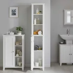 Featuring a contemporary marble effect with chrome handle to finish, this Tall Cabinet looks sleek and stylish, perfect for your bathroom space. It boasts 3 open shelves and 2 interior shelves, offering ample storage space for your home. Coordinate with our other marble bathroom storage units and accessories to complete the look. This range is exclusive to Dunelm.