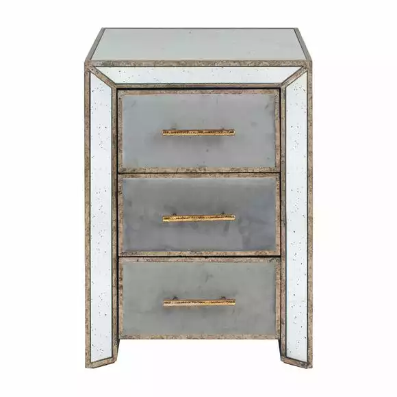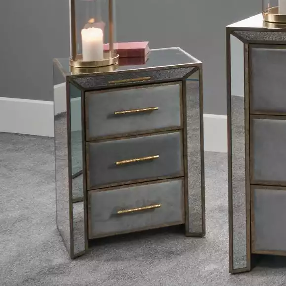Keep this bedside table next to your bed so you can have all your night time essentials close by. The three extra drawers provide you with that bit of extra storage for your smaller clothing items. The mottled mirrored glass paired with the velvet drawers and antique gold detailing give this bedside table a pinterest ready look.