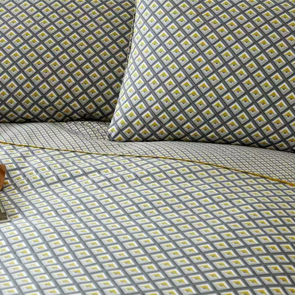 A stylish, ultra-modern geometric diamond-shaped bedding design with contrasting ochre yellow piping. A complimentary smaller diamond pattern is featured on the border and reverse of the bedding for additional flair. Contemporary colours of grey and ochre yellow hues match with today’s recent bedroom trends. This duvet cover set is machine washable for easy care and comes with coordinating pillowcase(s).