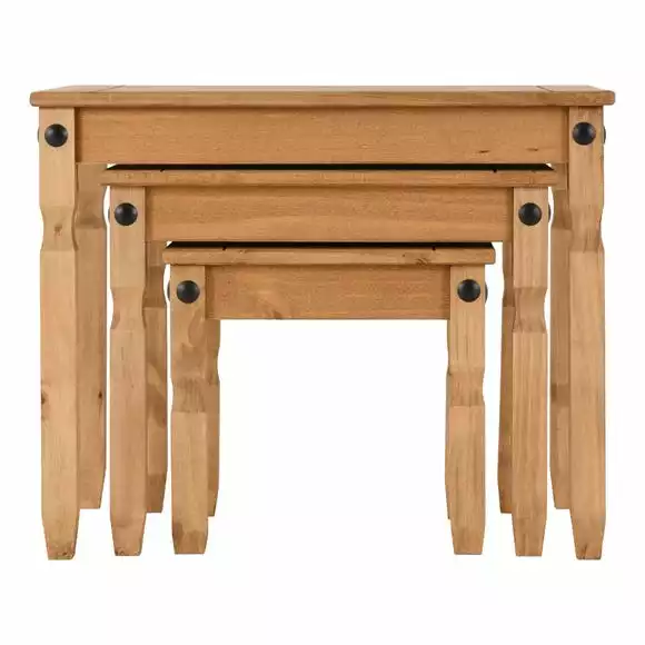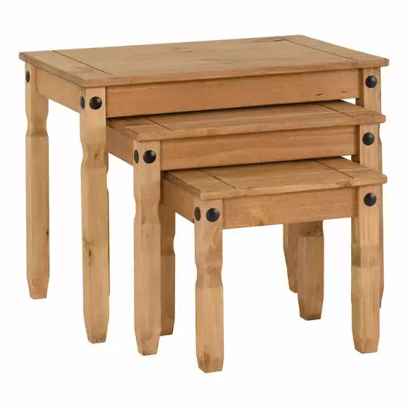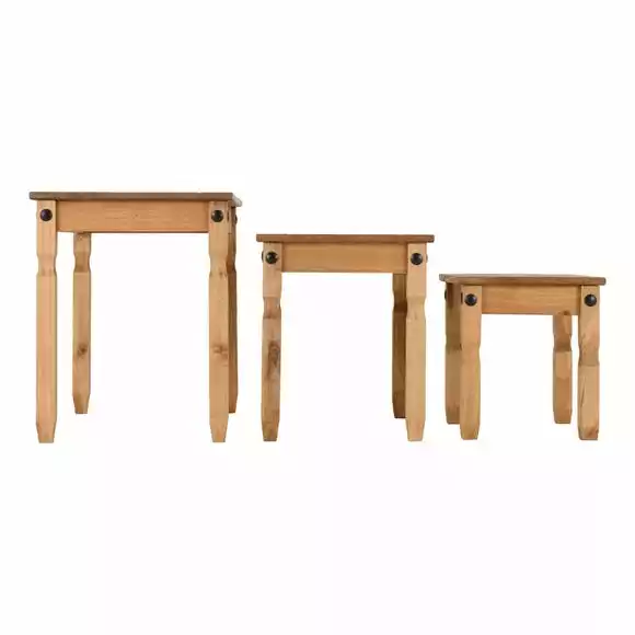 The Corona Nesting Tables are a great place to put down drinks, snacks and games! These traditional, rustic tables can be used together or separately, making them perfect for any space. Constructed from solid pine wood and finished in a distressed waxed pine finish.