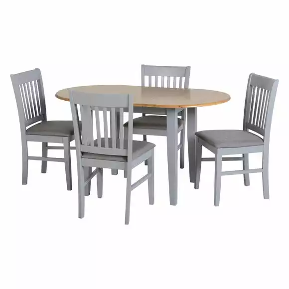 Crafted from solid wood, the oxford dining set is finished in a grey colourway, complete with a contrasting oak finish table top. The self-assembly dining set comes with 4 matching dining chairs and features a butterfly mechanism, allowing the table to be extended to make more space for guests.