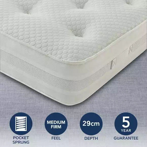 Created with a Mirapocket spring system to offer tailored support, as each spring is individually nested and reacts independently to the weight and movement of your body, providing even weight distribution and maximum sleeping space. Each of the pocket springs responds independently to weight and offer zoning across the mattress, scientifically proven to provide superior spinal alignment and body support.