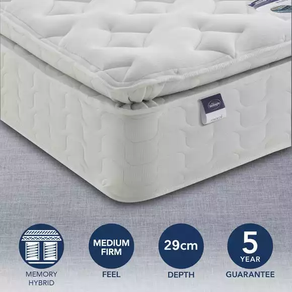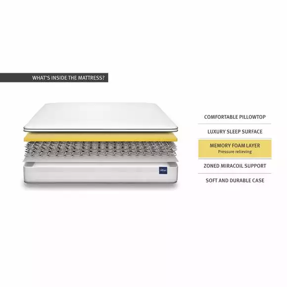 Featuring Silentnight’s Miracoil continuous coil spring system, this great value mattress combines unique technology with a quality finish to offer comfort and support for people of all shapes and sizes. The Miracoil spring system offers edge to edge support with no roll together, meaning less partner disturbance through the night. While its zoned structure provides spinal alignment to help aid good posture and relieve pressure build up. This is combined with indulgent, comfortable memory foam, offering responsive comfort, as it gently hugs the contours of your body and provides great pressure relief through the night. This is a hypoallergenic mattress, made to offer a medium firm feel with a sumptuous pillowtop finish for additional comfort.