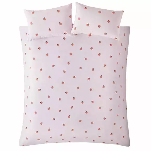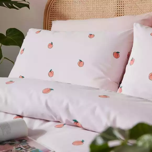 The iconic Skinny Dip peach design has been printed onto a duvet cover and pillowcase set in a feminine pale pink colourway. With easycare quality, this polycotton duvet cover set is simple to care for and is machine washable. A button fastening finishes the duvet cover off perfectly.